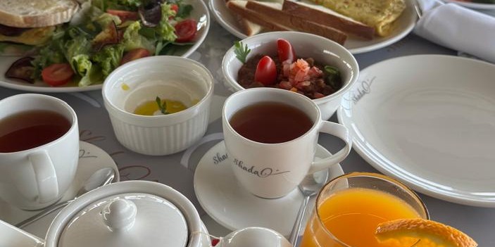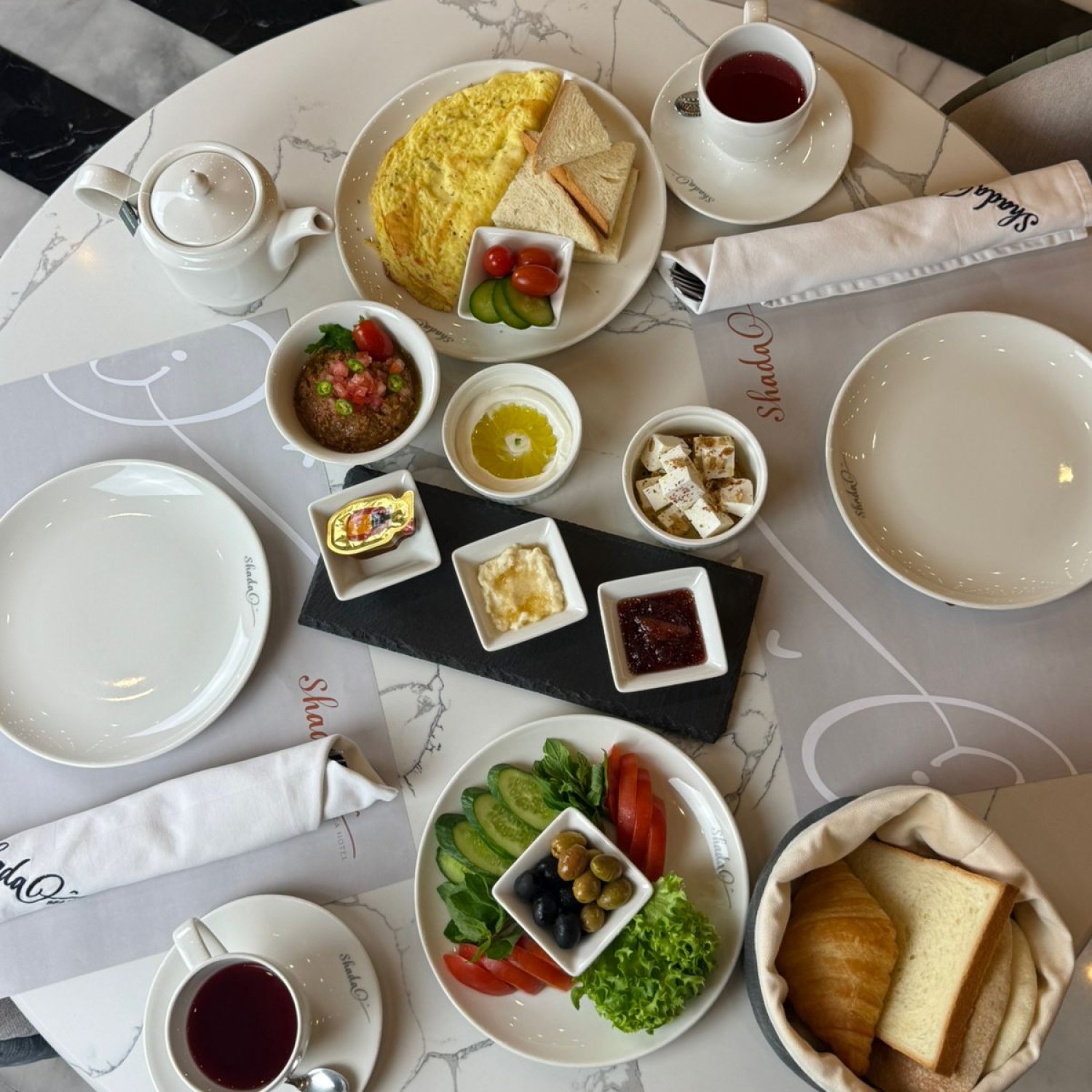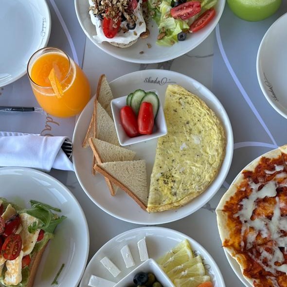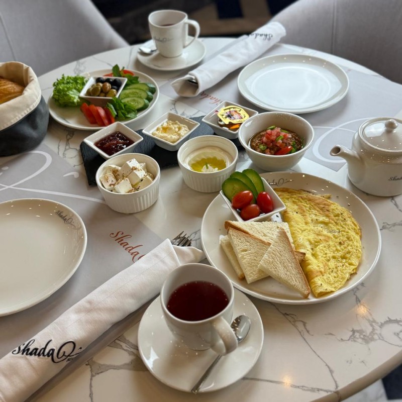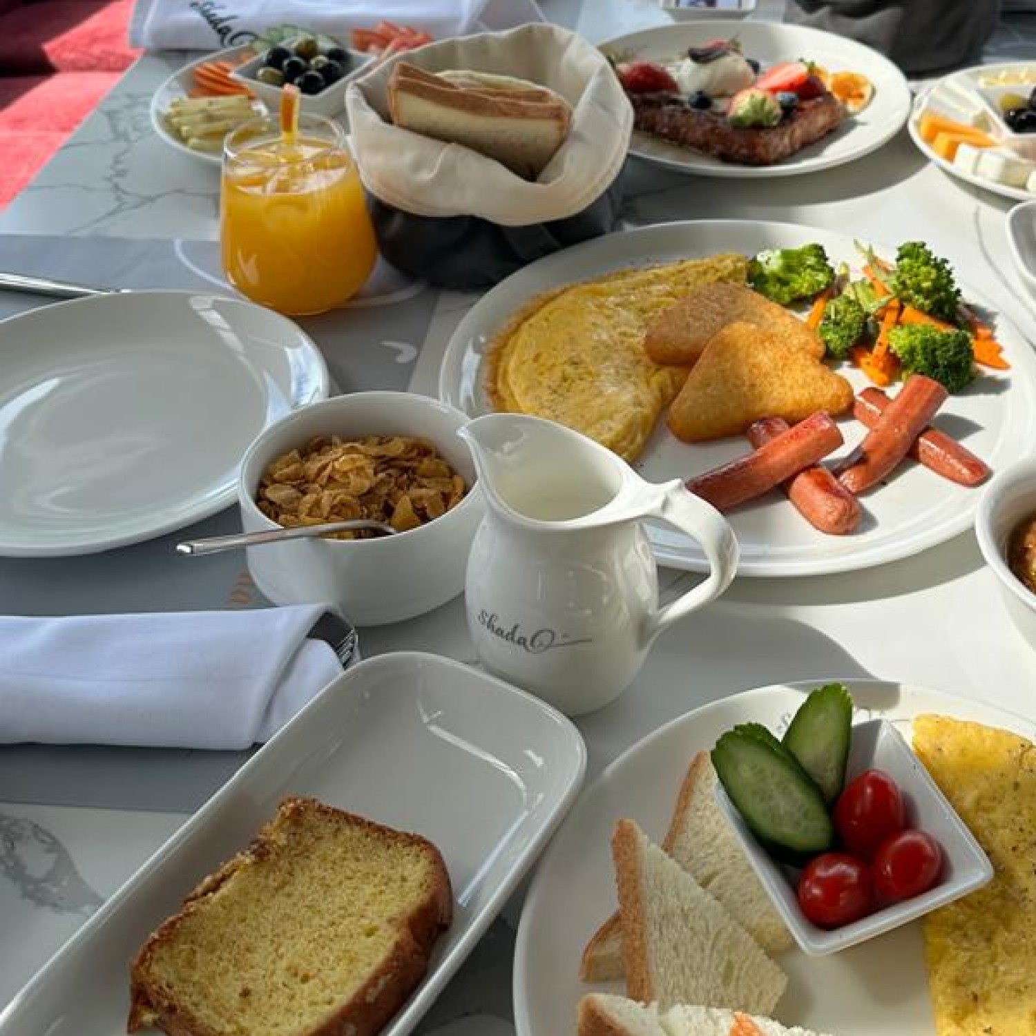 (895 سعرة حرارية)فول , اختياراتكم من البيض( اومليت , بيض عيون , بيض مخفوق ) , جبن فيتا , لبنة , تشكيلة خضراوات , قشطة طازجة ، مربى , عسل , سلة مخبوزات, شاي